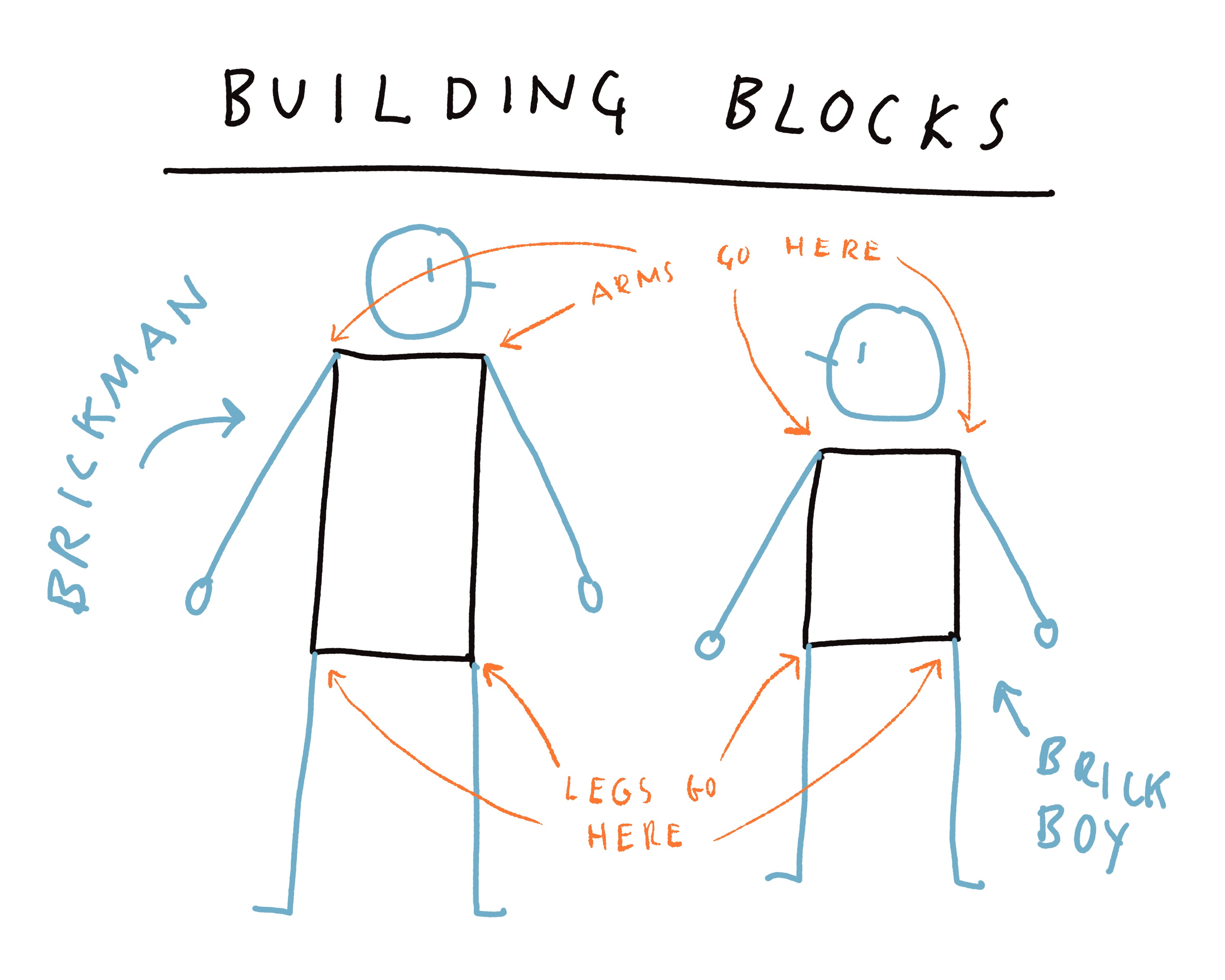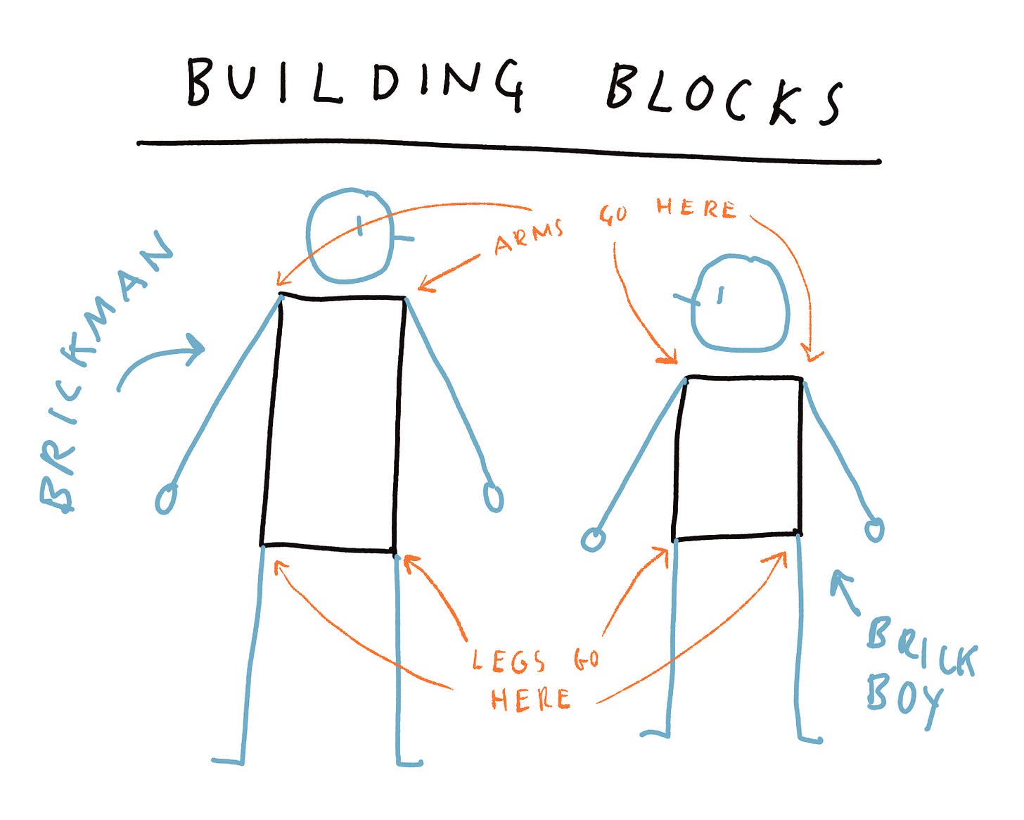 A head is a circle, a body is a rectangle or another circle hands and legs are lines. This will give you a modified stickman that Scriberia call âBrickmanâ.