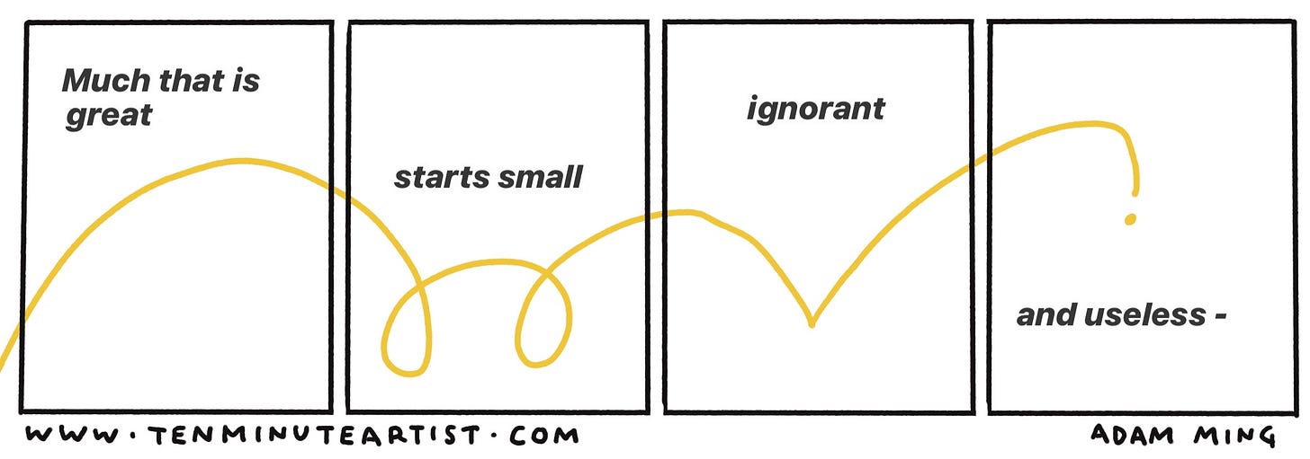 The beginner, the fool, is continually required to be patient and tolerant — with himself and equally, with others. His display of ignorance, inexperience and lack of skill may still be rightly attributed to irresponsibility and is often condemned, justly, by others. But the insufficiency of the fool is often better regarded as an inevitable consequence of each individual’s essential vulnerability, rather than as a moral failing. Much that is great starts small ignorant and useless -