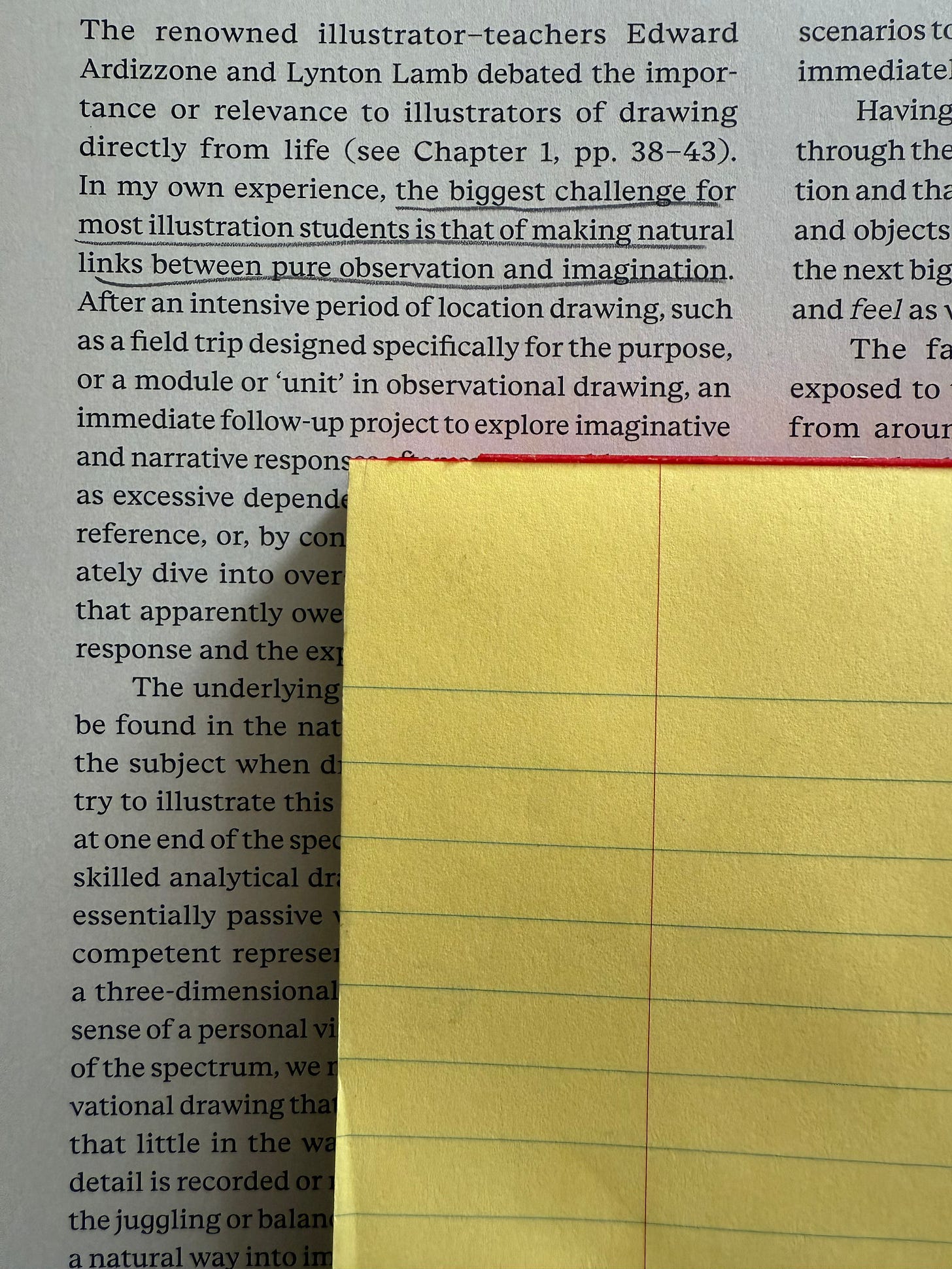According to Martin Salisbury in ‘Drawing for illustration’ the biggest challenge illustration students have is making natural links between pure observation (which is important) and imagination’.