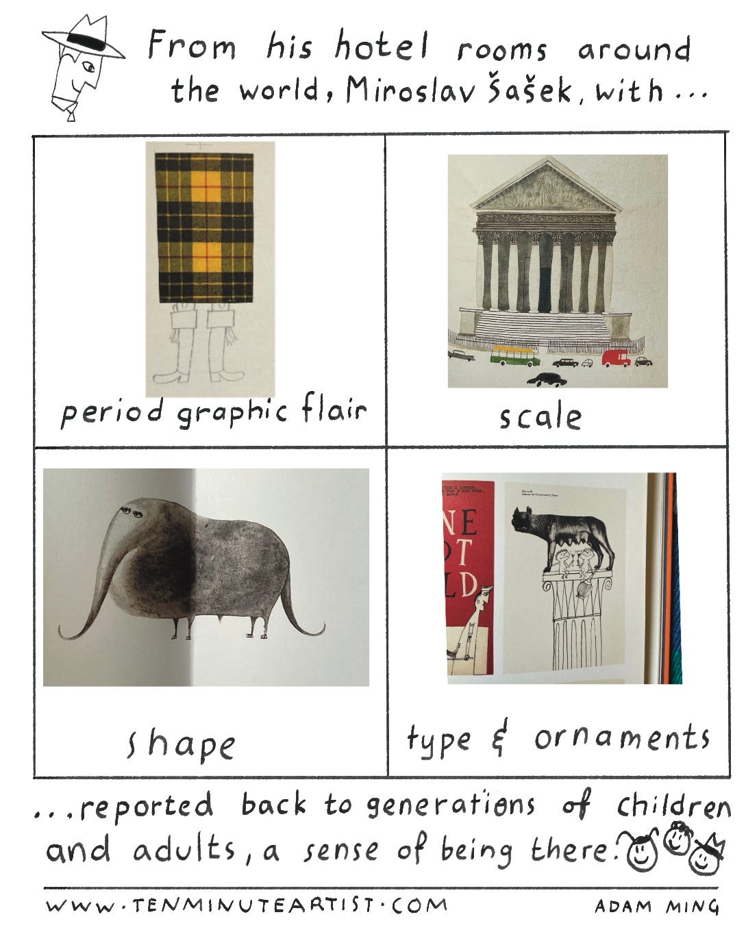 brushes that have come out in procreate.I read the Miraslav Sasek book from ‘the illustrators’ series. Mostly I looked at the illustrations. But I also enjoyed the introduction that was filled with such tasty and informative words, such as ‘graphic roportage’, I made today’s comic about it.